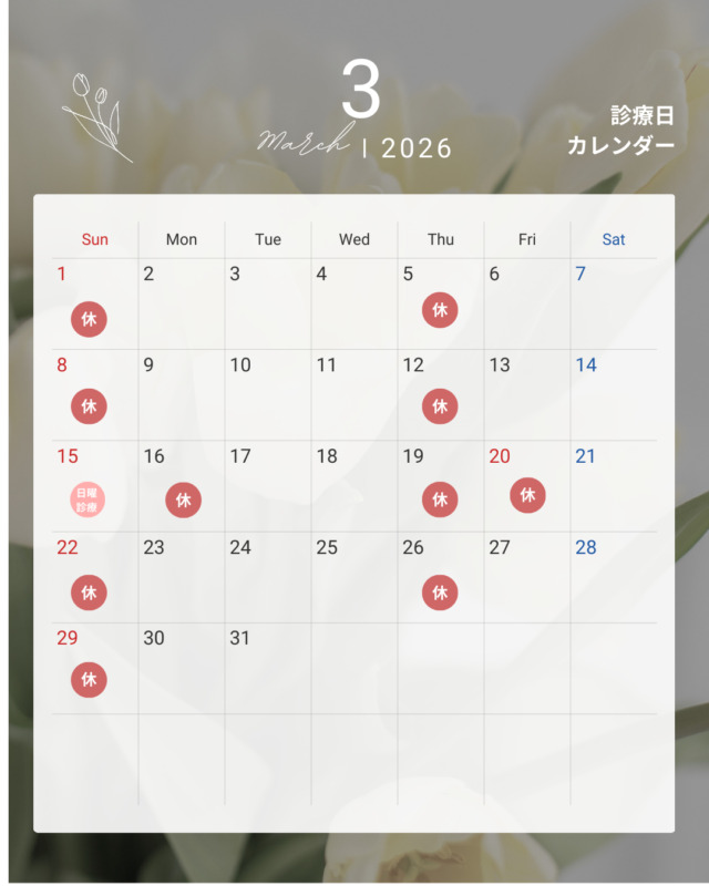 お知らせくぼた矯正歯科クリニック ホーム > お知らせ > 3月の診療カレンダー 2026年02月14日 3月の診療カレンダー次へ前へ一覧に戻る 理事長 久保田 衛医療法人プライムオルソ 理事長日本矯正歯科学会 認定医インビザライン公認クリニカルスピーカーカンボジアプティサストラ大学臨床教授〒983-0039 仙台市宮城野区新田東2-14-6 022-395-5888